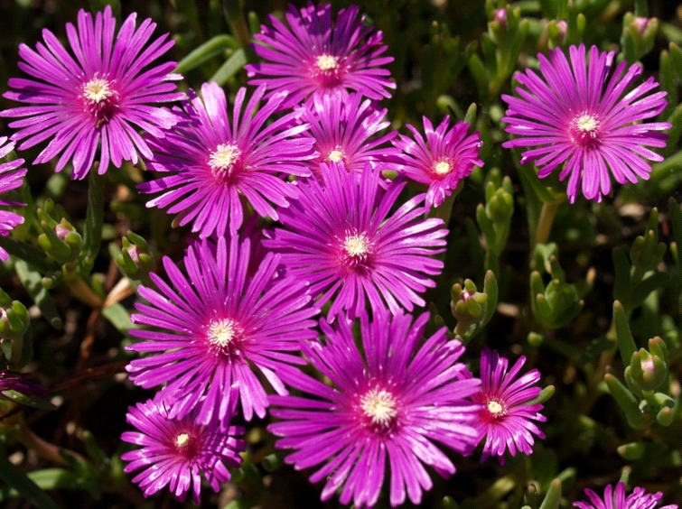 Рассада делоспермы Сазерленда быстро разрастается и красиво цветет - на коротких стебельках распускаются яркие цветы, похожие на маргаритки, с желтыми серединками и сиренево-пурпурными лепестками. Высота взрослого растения не превышает 15 сантиметров. Кустики плотно покрывают землю цветным ковром.