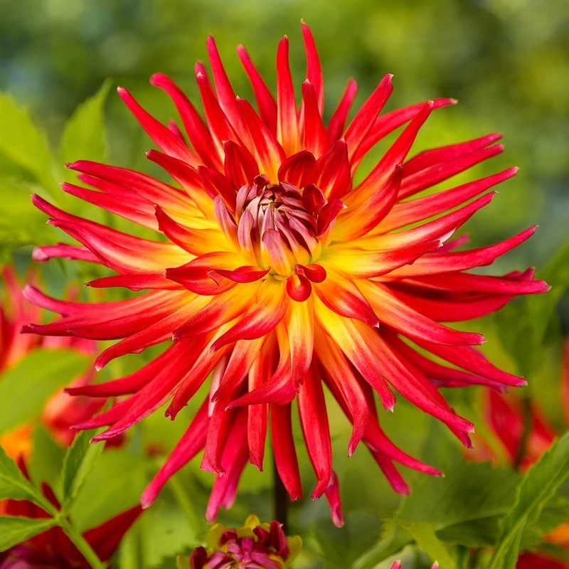 Георгина полукактусовая "Бора-Бора" - это великолепное растение с красивыми крупными цветками, окрашенными в яркий красный цвет с желтым центром. Ее стебель прочный и прямой, достигает высоты до 110 см, что делает ее заметным акцентом в саду или на клумбе. Листья георгины имеют необычную форму, что добавляет растению изюминку.