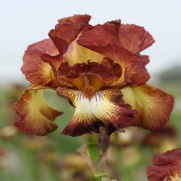 Ирис бородатый "Райд Джой" - это настоящее воплощение радости и красоты в вашем саду. Это растение поражает своей изысканной окраской цветков - красно-коричневый оттенок с кремово-жёлтым пятном в центре создает неповторимый эффект. Высота растения может достигать до 90 см, что делает его заметным акцентом в любом саду.