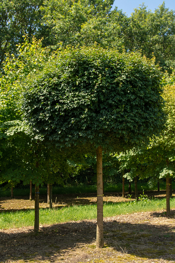 Саженцы клена полевого Нанум (Nanum) – сорт листопадных деревьев с изысканной естественной геометрией крон. На стройных прямых стволах молодых крупномеров эффектно покоятся круглые шапки из зеленой листвы. Взрослое растение вырастает в 2-3 м высоты. С возрастом крона становится более раскидистой и рыхлой. Цветет дерево мелкими желтыми соцветиями. Плодоносит клен полевой Нанум семенами-крылатками. Достоинства: