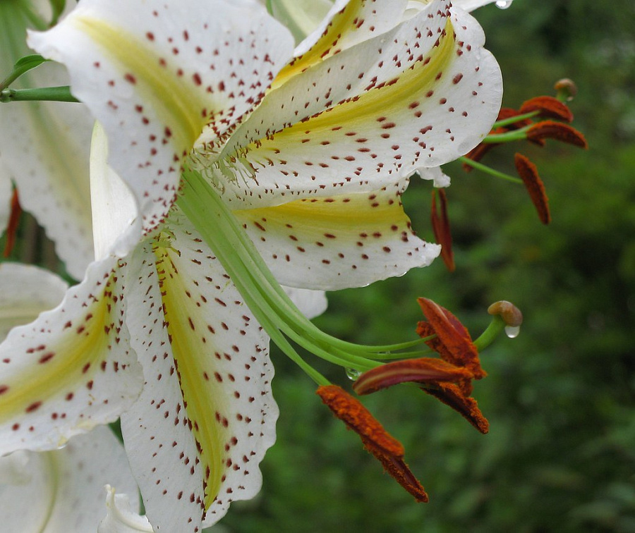 • Окраска цветка : крупный, белый, вдоль лепестков широкая ярко-желтая полоса, ярко-оранжевые пыльники и крап по большей поверхности лепестков